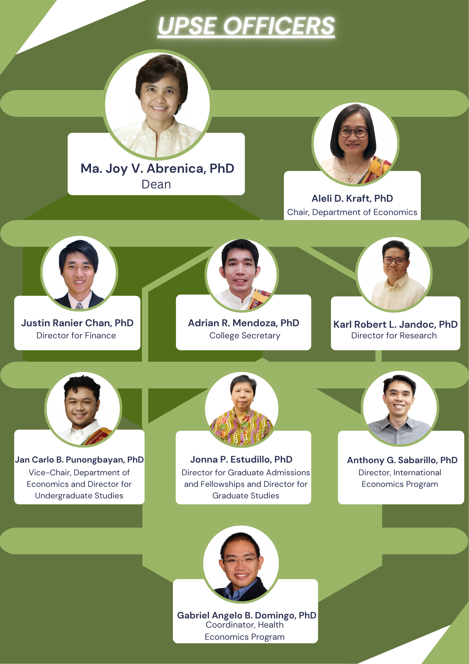 UPSE was designed to provide instructions leading to undergraduate and graduate degrees in economics. There are three functional departments in UPSE – the Department of Economics which is responsible for the academic degree programs, the Economics Research Center which oversees the School’s research projects, and the Public Affairs Office which coordinates the School’s various extension, training and public service activities.