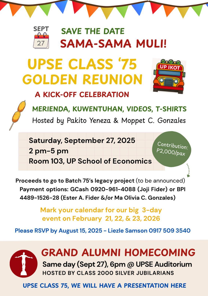 UPSE alumni Batch ’75 are getting together for the UPSE Class ’75 Golden Reunion on September 27, 2025, 2:00 PM at the UP School of Economics.